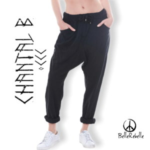 - Coupe droite, taille élastique avec cordon, bas des canons fendu, 2 poches latérales et 2 poches sur les fesses, sigle Etoile ChB sur poche arrière
